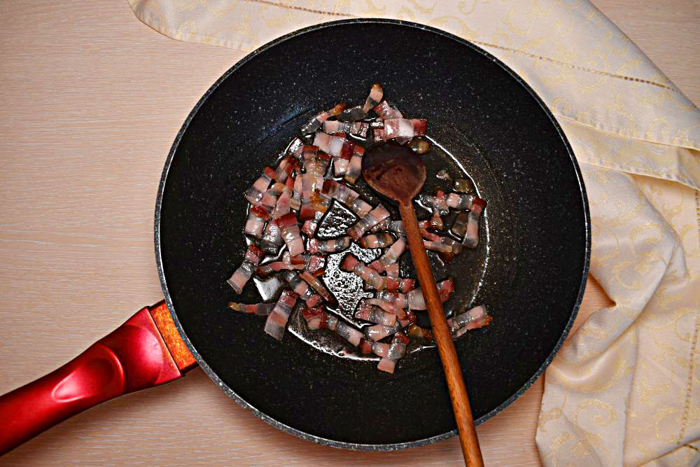 - U suvom tiganju propržiti slaninicu da pusti masnoću, izvaditi je rešetkastom kašikom i ostaviti po strani.