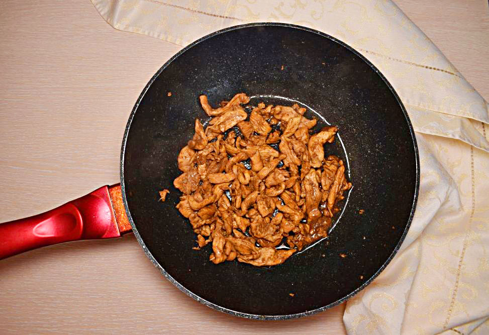 - Ćuretinu preliti soja sosom i promešati, pa dodati u masnoću od slanine i pržiti povremeno mešajući dok blago ne porumeni. Ocediti je od masnoće.