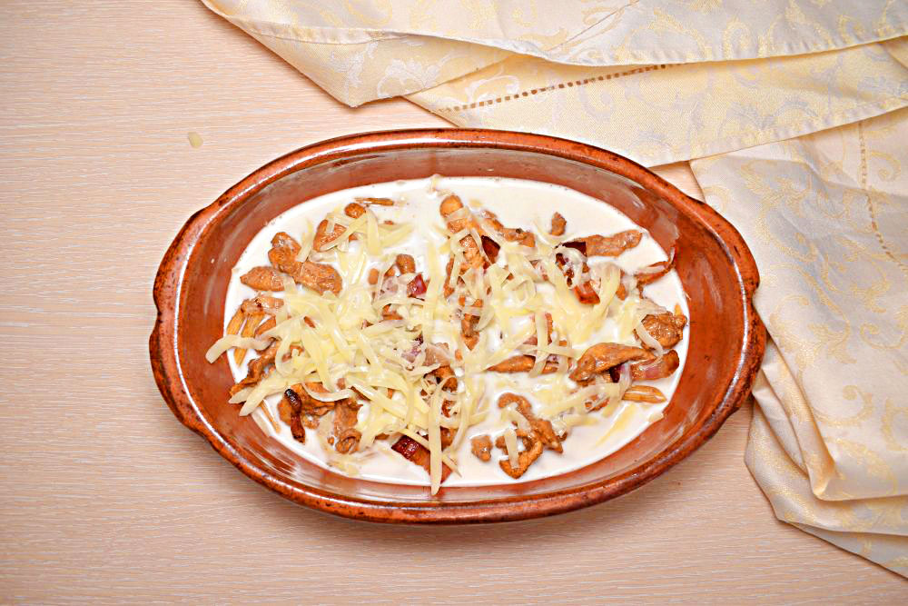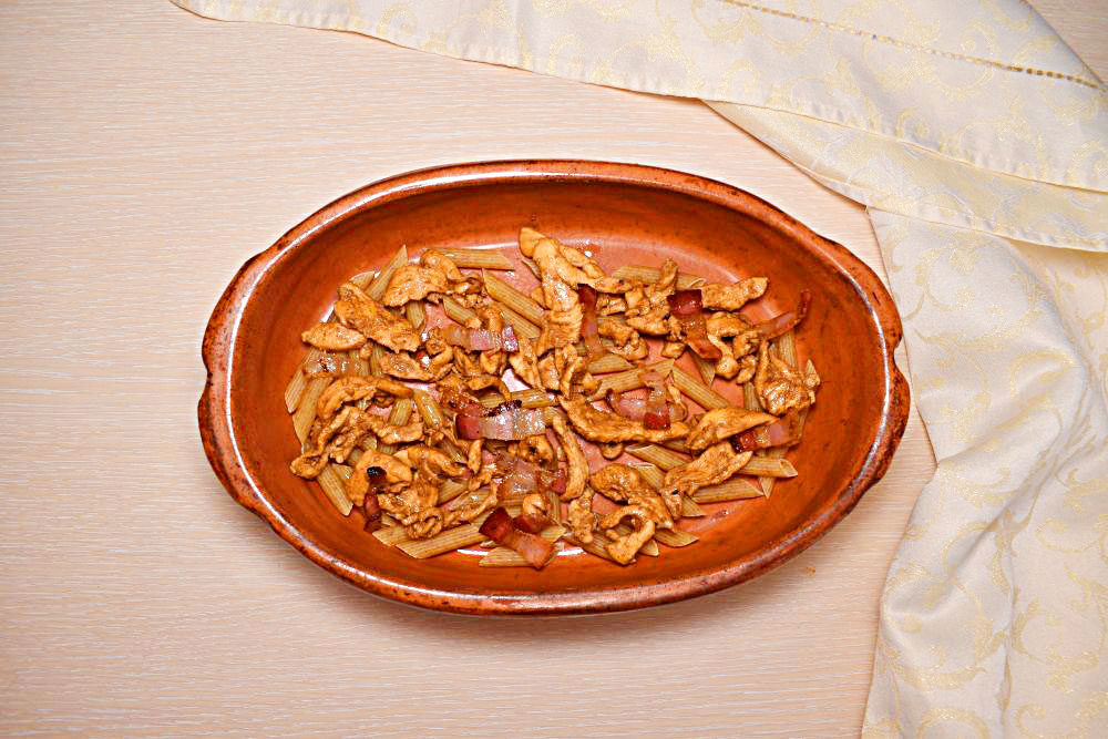 - Pripremiti manju zemljanu ili vatrostalnu činiju za dve osobe. Po dnu rasporediti nekoliko listića slanine i trećinu pržene ćuretine, te posuti trećinom integralne testenine i kačkavalja. Preliti trećinom mešavine pavlake za kuvanje i supe. Postupak slaganja ponoviti još dva puta, kako bi se utrošio pripremljeni materijal. Nakon završenog slaganja sastojci treba da su prekriveni smesom od pavlake i supe, ako nisu, po potrebi sipati malo vode ali ne više od 100 ml.