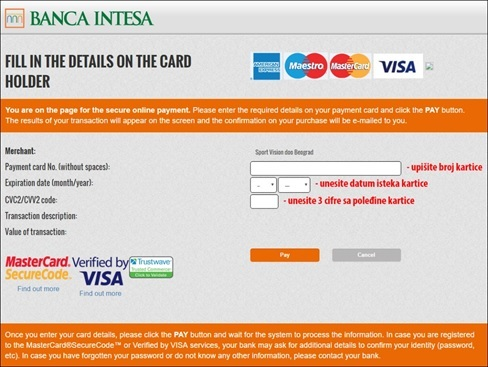 *Unos i provera podataka isključivo se obavljaju između korisnika kartice i banke Intesa, a Internet trgovac nema uvid u  podatke koji se razmenjuju.